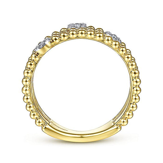 Gabriel & Co Yellow Gold Three Row Beaded Ring with Pave Diamond Cluster Stations