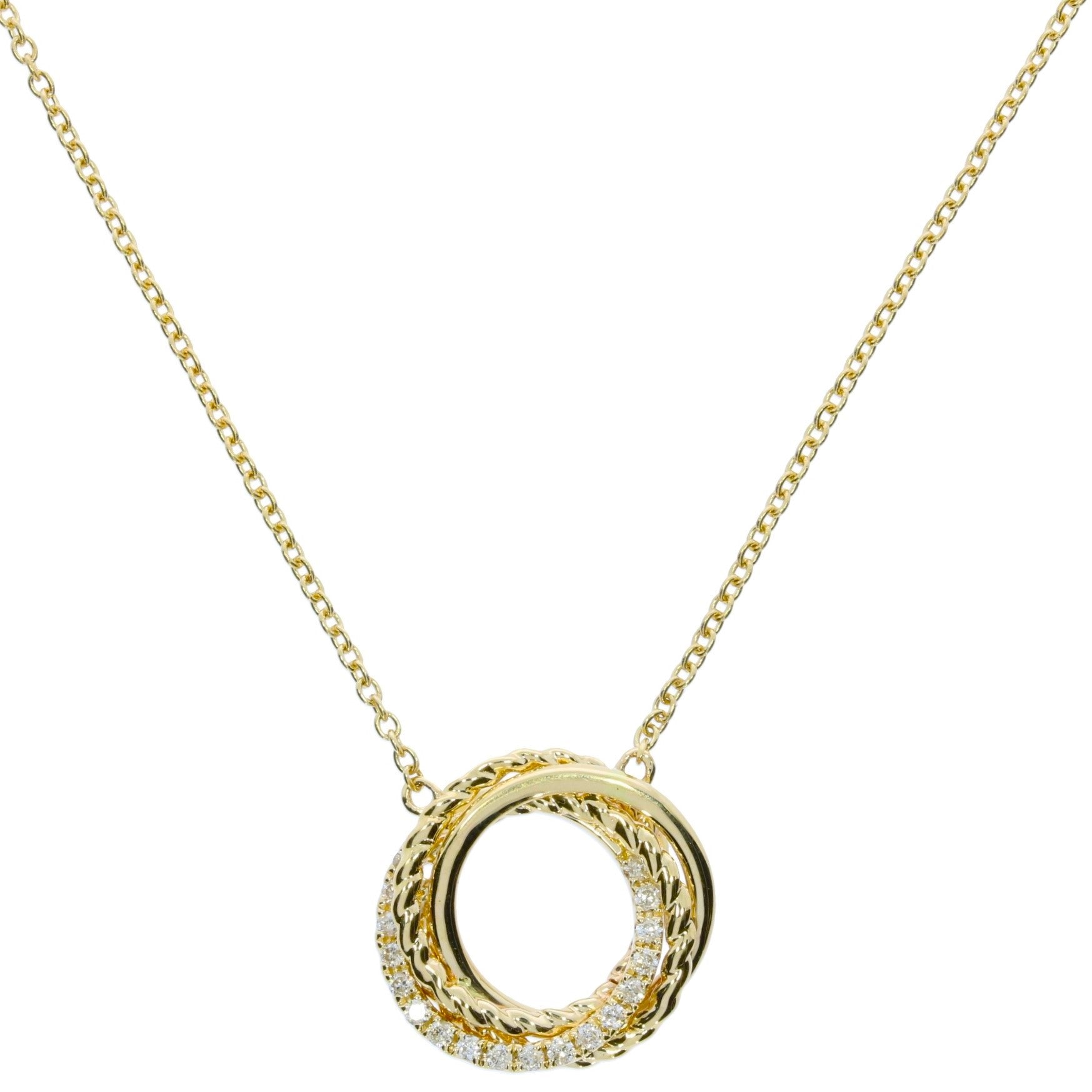 Ladies 14 Karat Yellow Gold Circle Swirl Pendant Set With 0.12 Carat Total Weight Round Brilliant Cut Diamonds; 18 Inch Cable Length Chain; SI Clarity; H-I Color