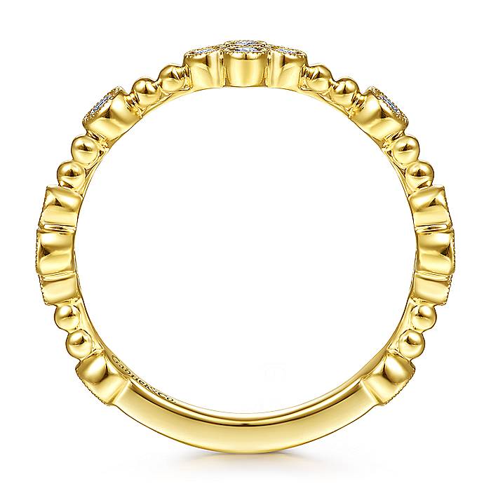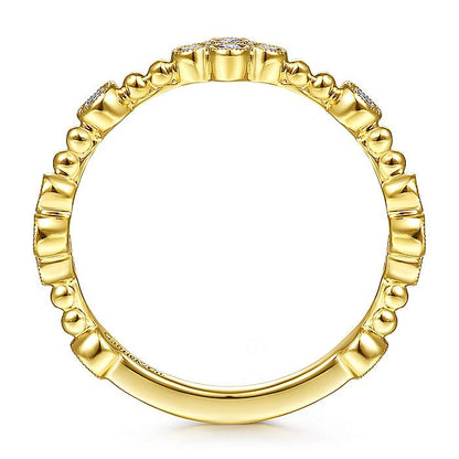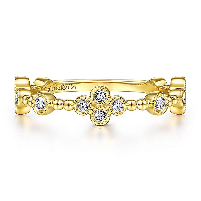 Ladies Gabriel & Co 14 Karat Yellow Gold Bezel Set Diamond Quatrefoil Stackable Band Containing 0.22 Carat Total Weight Round Brilliant Cut Diamonds; I1 Clarity; H-I Color; Finger Size 6.50; Serial Number: S1334508