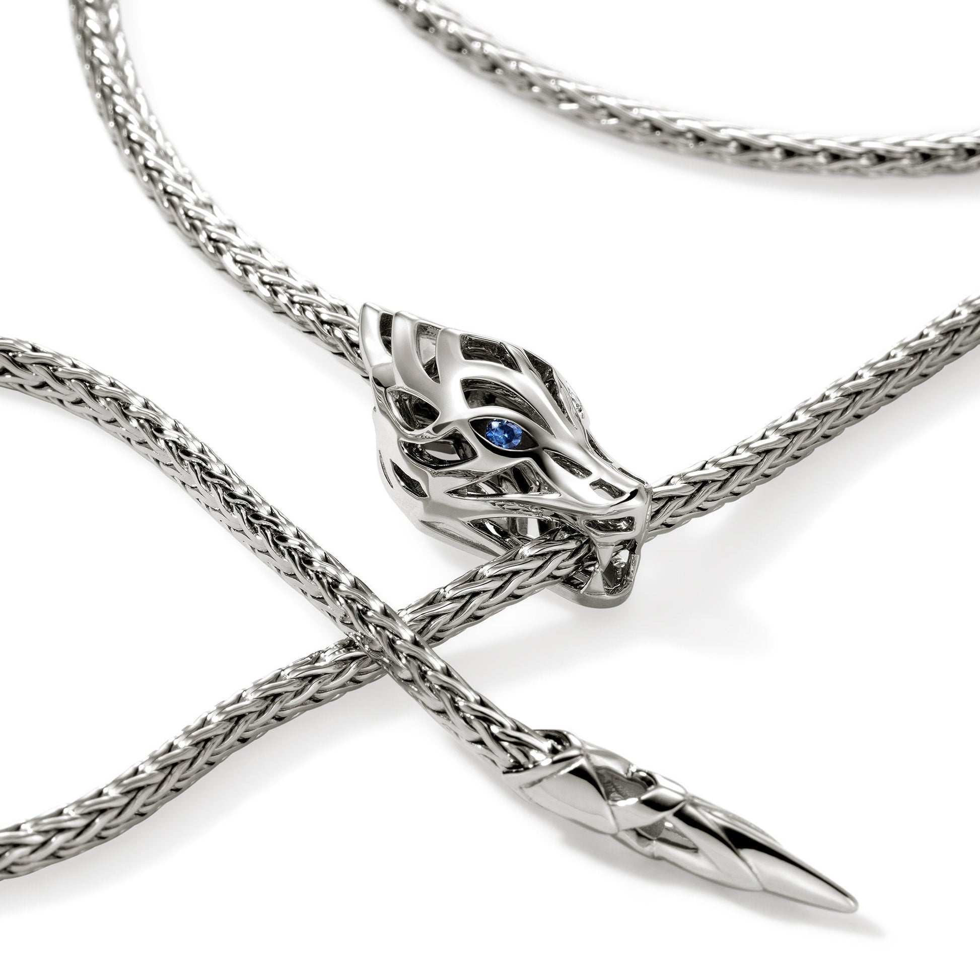 John Hardy Sterling Silver 2.5mm Woven Naga Adjustable Lariat Necklace Featuring Blue Sapphire Eyes On The Dragon Head And A Lobster Clasp; Length: 23 Inches