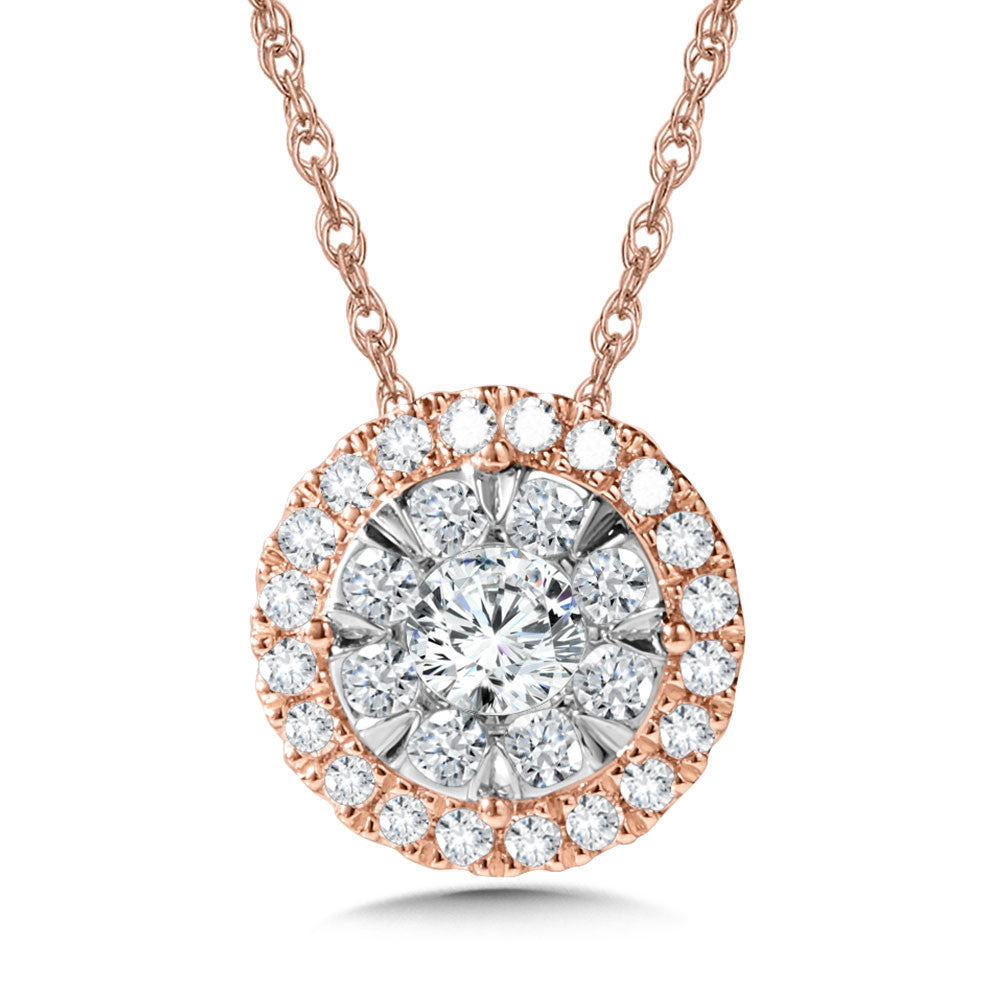 Ladies 14 Karat Rose and White Gold Round Double Halo Diamond Pendant Featuring 0.50 Total Carat Weight of Round Brilliant Diamonds