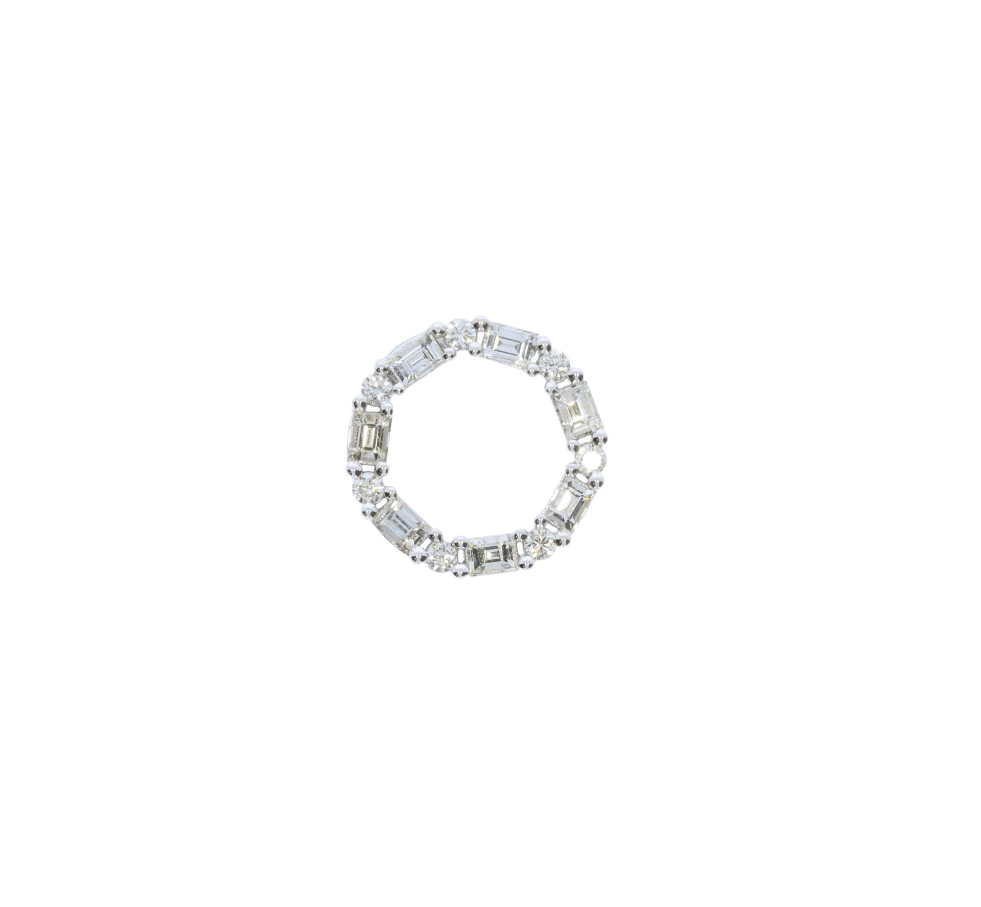 Ladies 14 Karat White Gold Circle Pendant Featuring 0.69 Total Carat Weight of Alternating Baguette and Round Brilliant Diamonds
