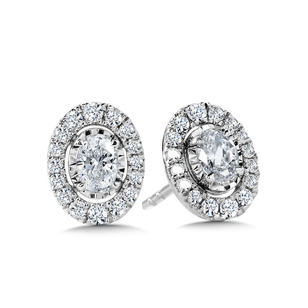 Pair Of Ladies 14 Karat White Gold Earrings Featuring Oval Shape Centers And A Halo Of Round Diamonds; 0.25 Carat Total Weight