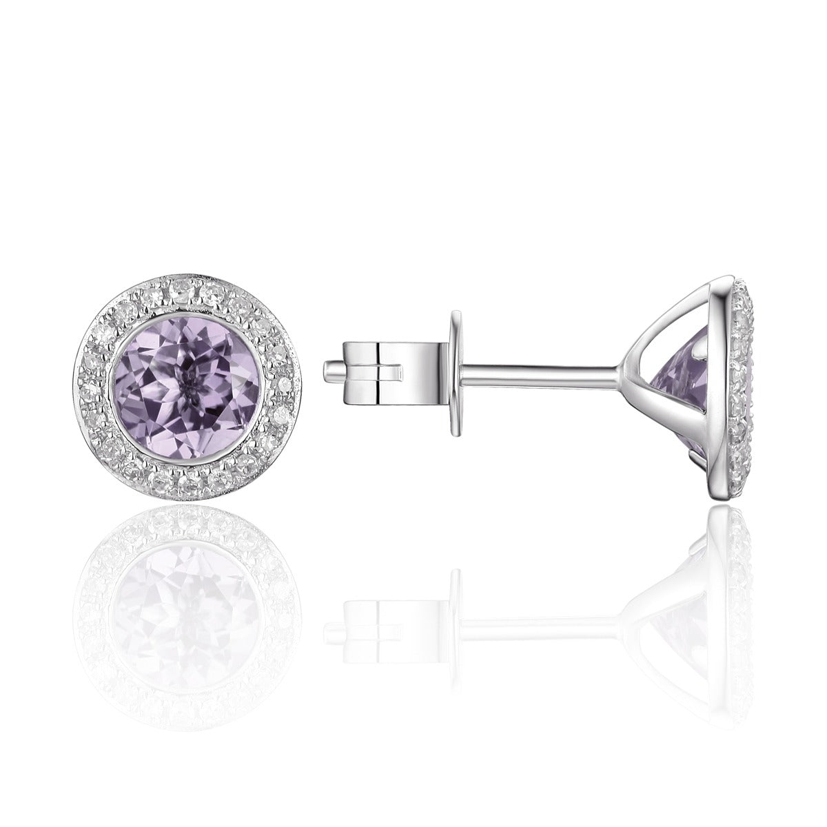 Ladies Luvente 14 Karat White Gold Lavender Quartz Round Diamond Halo Stud Earrings Featuring 1.34 Total Carat Weight of Lavender Quartz and 0.12 Total Carat Weight of Round Brilliant Diamonds