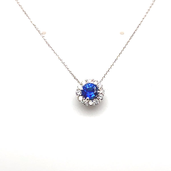 Ladies 14 Karat White Gold Cluster Pendant Featuring 0.58 Carat Total Weight Round Blue Sapphire And 0.25 Carat Total Weight Round Brilliant Cut Diamonds; SI Clarity; G-H Color
