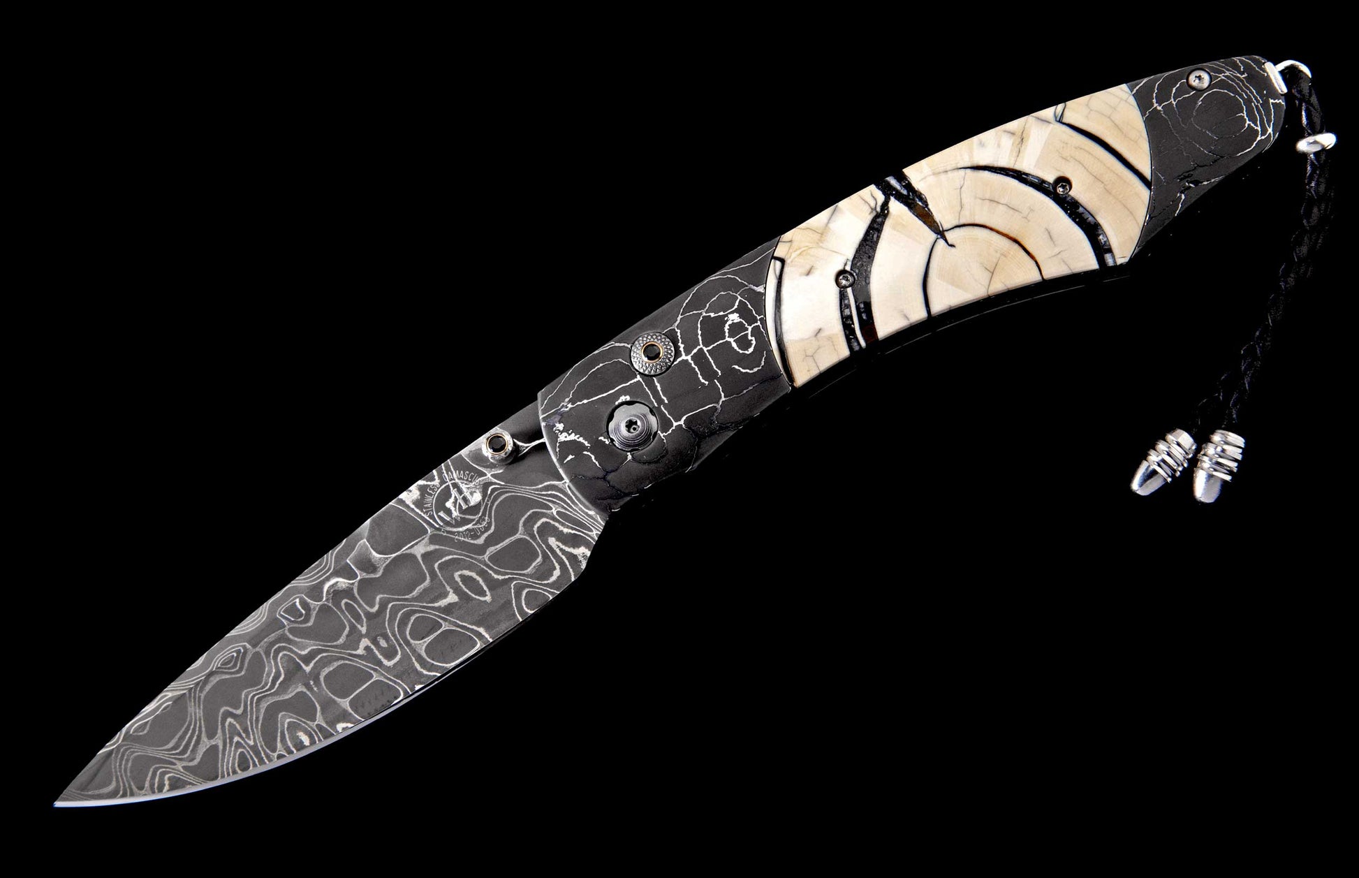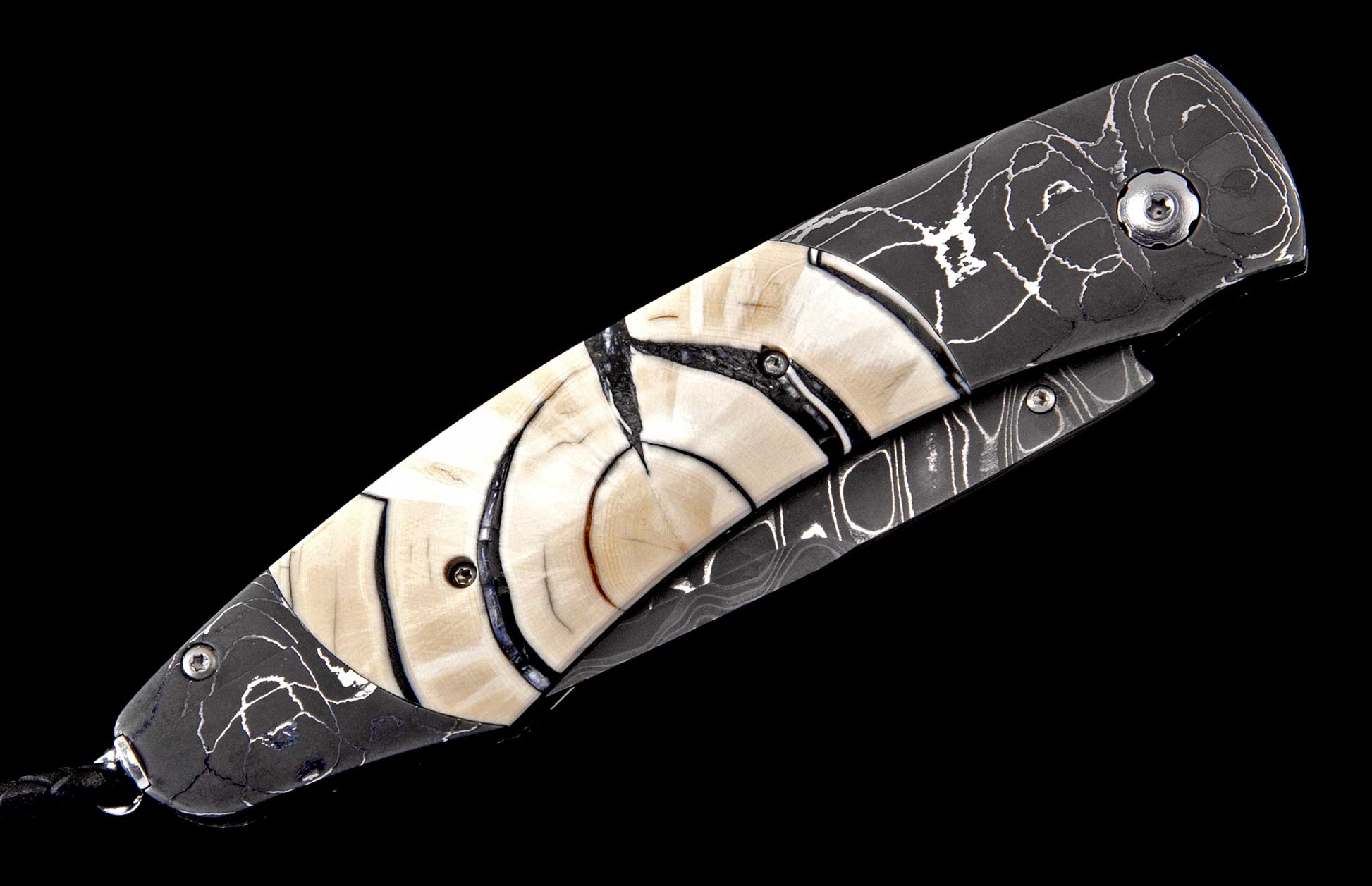 William Henry 'Adventure' Knife Features A Beautiful Frame In Hand-Forged, Etched 'T-Rex' Damascus By Delbert Ealy, Inlaid With 10,000 Year-Old Fossil Woolly Mammoth Tusk. The Blade Is 'Intrepid' Damascus By Chad Nichols; The One-Hand Button Lock And TheThumb Stud Are Set With Spinel Gemstones.